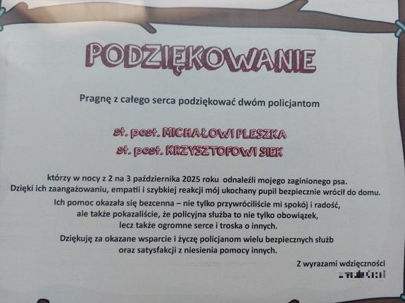 Podziękowanie dla policjantów, którzy pomogli odnaleźć zagubionego psa