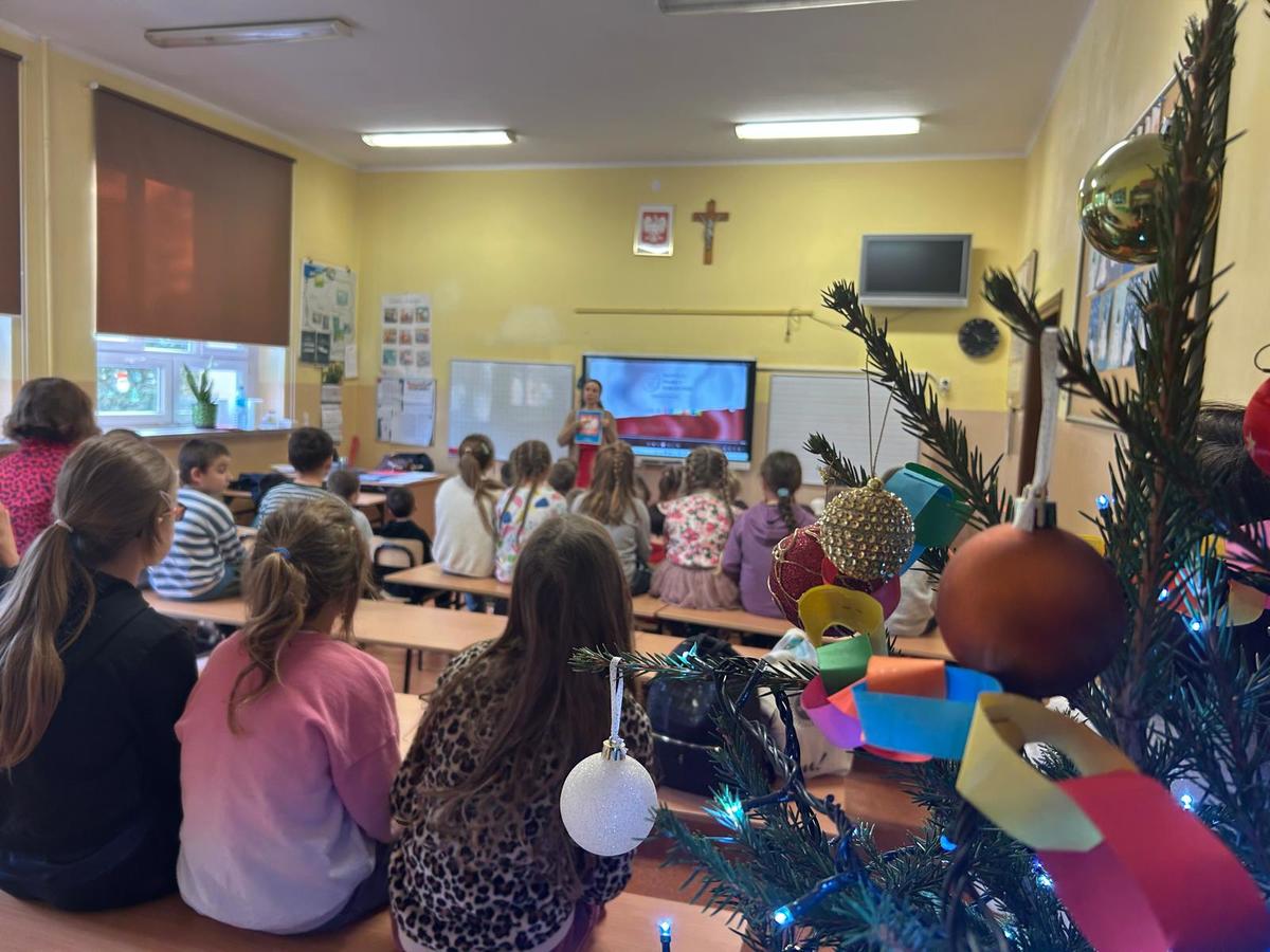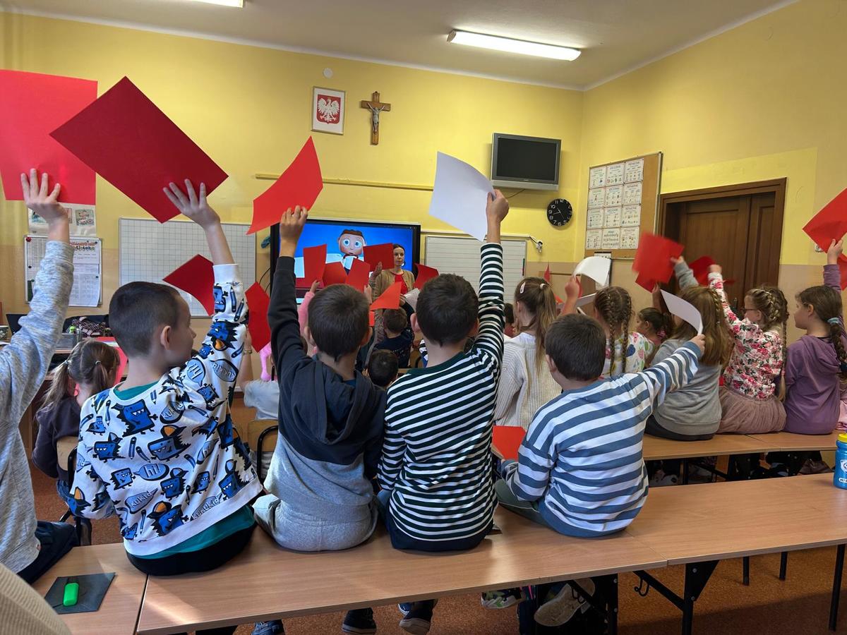Uczniowie obejrzeli film edukacyjny, po którym podsumowali swoją wiedzą o symbolach i kolorach związanych z państwem polskim. Usłyszeli też ciekawą historię o misiu, który został uznany za żołnierza i przeszedł szlak bojowy razem z armią Andersa.